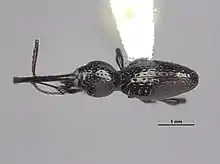 The antenna insertion point occurs at the middle in the rostrum in the female, and just beyond in the male. The rostrum is 1.00–1.08 times the length of the elytra in males, and 1.09–1.17 times in females.[1] The eyes occur at the rostrum's midlength, separated by about one half its width.[1] The globose prothorax is widest at the middle and characterized by very few large, deep punctures and erect setae scattered throughout.[1] The elytra have numerous erect setae, and the humeri are non-angulate and fully reduced.[1]