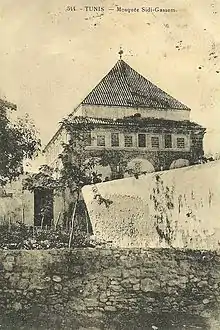 Built during the second half of the 15th century[1] on a hill overlooking the kasbah of Tunis, it was the home of Sidi Kacem El Jellizi, a Tunisian saint born into a family of Andalusian migrants who stayed in Fez before settling in Hafsid Ifriqiya.[2] Nicknamed jellizi in reference to the craft of zellige manufacturing that he exerted with great skill,[2] he was known for his great piety, benevolence and generosity: the place served as a refuge for travelers and traders, as well as Andalusian refugees after the capture of Granada in 1492, which increased his consideration with the Hafsid leaders and the veneration of the population.[2] After his death in 1496, he was buried in the building, which was decorated by himself or his spiritual and artistic followers.[2]