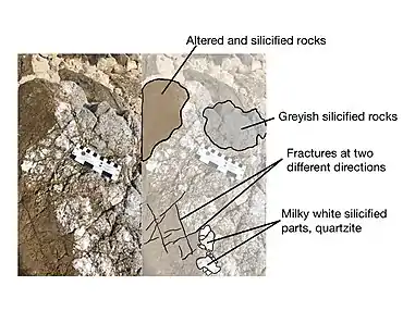 The Mount Goldsworthy in the Pilbara Craton located in Western Australia holds one of the earliest silicification example with an Archean clastic meta-sedimentary rock sequence, revealing the surface environment of the Earth in the early times with evidence from silicification and hydrothermal alteration. The unearthed rocks are found to be SiO2 dominant in terms of mineral composition.[8] The succession was subjected to a high degree of silicification due to hydrothermal interaction with seawater at low temperatures.[8] Lithic fragments were replaced with microcrystalline quartz and protoliths were altered during silicification.[8] The condition of silicification and the elements that were present suggested that the surface temperature and carbon dioxide contents were high during either or both syn-deposition and post-deposition.[8]