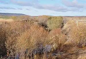 From its headwaters in the southern Blue Mountains, Silver Creek flows south through the Ochoco National Forest[6] and is fed by tributaries and, at the base of the mountains, large springs feed the creek.[7] The creek meanders through a broad alluvial plain[7] and turns southeast near Chickahominy Reservoir, traveling through the unincorporated community of Riley, where it is crossed by Highway 20 and Highway 395, respectively.[6] Past Riley Silver Creek flows through a canyon with 200-to-300-foot (60 to 90 m) tall walls made of volcanic basalt.[7] The creek is impounded several miles downstream, forming Moon Reservoir.[6] It then splits into two streams; one portion heads southwest into the usually dry Silver Lake, while the other portion flows southeast through Warm Springs Valley into the Malheur National Wildlife Refuge, and finally Harney Lake.[6][8]