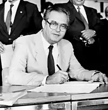 On October 30, 1989, seven days before the deadline to formalize his candidacy, in an apartment at the Brasília Tennis Academy, Silvio, Armando Corrêa, and senators Marcondes Gadelha, Edison Lobão and Hugo Napoleão held a meeting, which started around midnight, about the presenter's candidacy.[11][12][13] Corrêa, who was a candidate for the Brazilian Municipalist Party (PMB), agreed there with the replacement of his candidacy with Silvio's, but said that it was still necessary to contact his "bases". According to Gadelha, that would be a moment to be "disloyal" with the press and avoid them at all costs, since many were against Silvio's candidacy, and also to avoid information leakage, as it happened with the PFL candidacy attempt. Eliane Cantanhêde, from Estado de S. Paulo, was also waiting on the spot, representing a "warning sign".[14]