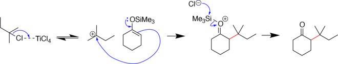 Silyl enol ethers are used in many reactions resulting in alkylation, e.g., Mukaiyama aldol addition, Michael reactions, and Lewis-acid-catalyzed reactions with SN1-reactive electrophiles (e.g., tertiary, allylic, or benzylic alkyl halides).[16][17][18][13][12] Alkylation of silyl enol ethers is especially efficient with tertiary alkyl halides, which form stable carbocations in the presence of Lewis acids like TiCl4 or SnCl4.[12]