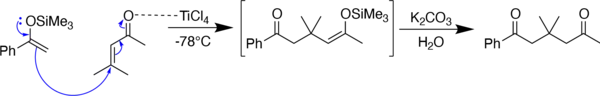 Example Michael reaction using a disubstituted enone and the silyl enol ether of acetophenone, catalyzed by the Lewis acid TiCl4 at low temperature.