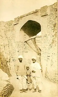During the medieval period and prior to the Mughal rule, the costumes worn by the people of Sindh resembled the dresses worn in Iraq and adjoining countries.[8][9] The dresses included short tunics and Iraqi style long robes. If any drawers were used, they were of the Iraqi style, such as the pantaloons which were also adopted in neighbouring Multan and also in the coastal areas of Gujarat.[10] However, the use of such Iraqi clothes in Sindh was limited to Mansura,[11] the Arab capital city, established in 712 C.E.[12] and was not universally adopted throughout the region. Arab rule in Sindh ended in 1050 C.E.[13] Further, alongside these dresses, Sindhis also wore other traditional attire.