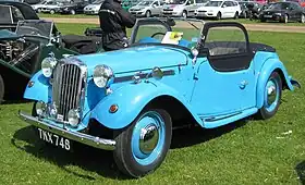 The successful Roadster re-appeared following the war, in 1946, with these modifications: non-lubricated rubber shackle bushes, improved seating accommodation provided by moving the engine forward and an improved lid at the rear of the body providing a flat platform for luggage.[7] These changes seem to have improved the handling.[5] Better engine mounts and other isolations were introduced, providing a smoother ride and lessening maintenance. Cars began to filter out to the dealers in September 1946.[8] Nearly all post war production was exported the car being popular with the Elite in India and featured in the collections of a few Maharaja's.