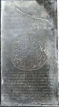 The ledger stone of Sir Amyas Pollard (1616–1701), 3rd Baronet, survives before the altar in Abbots Bickington Church, Devon, inscribed as follows: "To the memory of Sr. Ames Pollard, Barron(e)t, who departed this life June the 5th 1701 and was here interr'd the 7th of the same in ye 85th year of his age". Below is an heraldic achievement of Pollard showing an escutcheon of the Pollard arms: Quarterly 1st & 4th, a chevron between three escallops; 2nd & 3rd: a chevron between three mullets; overall the Red Hand of Ulster. Above the escutcheon is the crest of Pollard: A leopard's head and neck erased. Beneath is the following verse:
