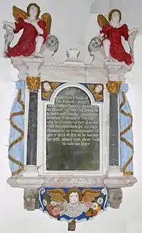 A newly re-painted mural monument exists to Thomas Pollard (1681–1710), in Abbots Bickington Church, Devon. On a rectangular panel with arched top between two Corinthian columns and below a broken classical pediment is the following inscription: Here under lyes ye body of Tho: Pollard ye son of Sr. Ames Pollard Bart. who departed this life Decem(be)r ye 9th 1710 ye 29th year of his age. He had to wife Sarah ye daughter of Jonathan Prideaux of Thu(borough) Esqr. who by ye order of her dear deceas'd husband hath set up this monument in remembrance of him & doth desire to be laid here her selfe when it doth please God to take her hence. Above on either side is an angel holding an escutcheon, on the dexter one of which has recently been re-painted the escallop arms of Pollard. On top between the two angels was formerly a shield showing the quarterings as sculpted in relief on the ledger stone of his father before the altar in the same church. Below the base in the centre is the head and shoulders of a winged putto on a garland of flowers with a skull on each side beneath the columns.