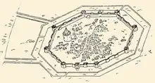 The castle had an octagonal shape. Each wall was around 100 metres long, which means that the castle occupied a surface of around 3.5-4ha. Each of the corners had a hexagonal bastion. Overall the castle had 2 gates which were secured by drawbridges as the walls were surrounded by water. The wall that faced the seas was accompanied by a tower to secure the castle against any amphibious landings. It housed a garrison of several hundred soldiers.[1]