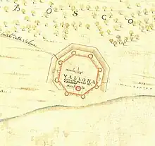 No photographs of the castle exist, its appearance has only been described or documented through drawings.[1] Up until at least the 1930's the outline of the castle is visible on old aerial photographs.[7] Today the Flamurtari Stadium occupies most of the site of the former castle.[1]