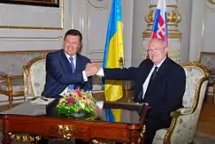 During the Interwar era the Ukrainian oblast Zakarpattia was part of Czechoslovakia, before being ceded to Hungary.[1] In 1993, during an official visit to Ukraine, the first president of independent Slovakia Michal Kováč signed an agreement on establishing constructive relations between the two countries. Multiple visits have subsequently been made from Slovakia to Ukraine from 2000 to present. In March 2022, the Slovak embassy in Kyiv temporarily suspended its work due to the Russian invasion of Ukraine. The embassy resumed its work on April 12, 2022.[2]