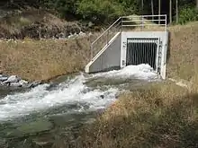 The earthfill Sly Park Dam is 190 feet (58 m) high, with a hydraulic height of 170 feet (52 m), and 760 feet (230 m) long. Its auxiliary dam is 130 feet (40 m) high and 600 feet (180 m) long. The spillway of Sly Park Dam is actually in the auxiliary dam: it is a concrete chute 170 feet (52 m) long and can carry 6,700 cubic feet (190 m3) per second, while the outlet works at the foot of the dam can carry 47 cubic feet (1.3 m3) per second. The drainage area of Sly Park Creek behind the dam is 47 square miles (120 km2).[1] The Camino Conduit diverts water roughly 7.2 miles (11.6 km) west from the Jenkinson Reservoir for irrigation purposes. Water is also diverted from Camp Creek into Jenkinson Lake to increase the total water yield.