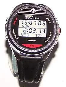 With the introduction of personal computers in the 1980s, Seiko began to develop computers in the form of watches. The Data 2000 watch (1983) came with an external keyboard for data-entry. Data was synced from the keyboard to the watch via electro-magnetic coupling (wireless docking). The name comes from its ability to store 2000 characters.[7] Its memory was tiny, at only 112 digits.[6] It was released in 1984, in gold, silver and black.[8] These models were followed by many others by Seiko during the 1980s, most notably the "RC Series". The RC-1000 Wrist Terminal was the first Seiko model to interface with a computer, and was released in 1984,[7] subsequently priced at around £100,[9] providing 2 KB of storage and a two-line 12-character display, transferring data from a computer using an RS232C interface.[10] It was developed by Seiko Epson and was powered by a computer on a chip and was compatible with most of the popular PCs of that time, including Apple II, II+ and IIe, BBC Micro,[11] Commodore 64,[12] IBM PC, NEC 8201, Tandy Color Computer, Model 1000, 1200, 2000 and TRS-80 Model I, III, 4 and 4p. The RC-20 Wrist Computer was released in 1985, under the joint brand name "Seiko Epson".[13][14] This was followed by the RC-4000 and RC-4500.