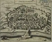 The territory of Smolensk was part of the Grand Duchy of Lithuania since 1404, but the voivodeship was established only in 1508.[1] Just six years later, in 1514, it was lost to the Grand Duchy of Moscow during the Muscovite–Lithuanian Wars.[2] The voivodeship was recaptured by the Commonwealth in 1611 during the Polish–Muscovite War (1605–18) and lost again in 1654 during the Russo-Polish War (1654–67).[2] Even when the territory was under Russian control, Poland and Lithuania claimed it as a titular voivodeship. The capital of the voivodeship, and the seat of its governor (voivode), was in Smolensk. It was subdivided into two powiats: Smolensk and Starodub.