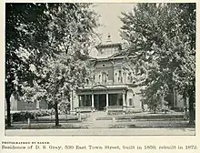 In 1869, David S. Gray, a philanthropist and railroad magnate, owned the house, purchased from his brother-in-law William Richards.[6] His wife Eugenia would often hold parties at the house, and reportedly would use the house's cupola to observe her guests' outfits, allowing her time to change clothes if another female guest had a gown that mimicked or rivaled hers.[7] The couple raised four children at the house, and was married there in 1865. In 1872, the house was reportedly rebuilt by George Bellows Sr. David Gray died there in 1921, and did not want the house to leave the family, though as early as the 1930s, the mansion became a rooming house, and later, home to the Columbus Women's Clubhouse Association.[2] Its organizer, Celinda Hatton, is rumored to haunt the house, walking through it wearing a pink robe, holding a drink in her hand.[7] The house is included in Columbus Landmarks' long-running "Ghosts of Town-Franklin Tour" because of the reported sightings.[11] The building later housed a candy company, and later, apartments.[6]