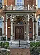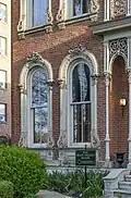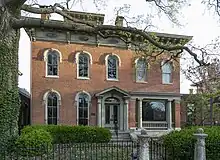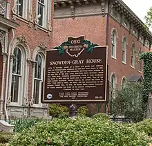 The Snowden-Gray mansion is located on East Town Street in Downtown Columbus, close to Topiary Park.[1] The surrounding Town-Franklin neighborhood is considered the city's first suburb, first subdivided in the 1840s, with early fashionable residences constructed in the 1850s, and its lots filling in during the subsequent prosperous decades.[2] The location, eight blocks east of High Street, was considered the outskirts of Columbus in the 1850s.[3] The house is considered to be the finest example of Italianate villa architecture in Central Ohio,[2] and the focal point of the East Town Street Historic District.[4] It is designed in the High Victorian Italianate style. The mansion has two-and-a-half stories, topped with a cupola or belvedere at its center, with a finial on its roof. The original structure measures 45 feet square, and has a stone foundation. The entranceway to the house is arched and paneled. It windows have ornamented stilted arch hood molding. The house's bracketed cornice is ornate as well.[5] The property is surrounded with a wrought-iron fence with a fleurs-de-lis pattern (also the symbol of the Kappa Kappa Gamma sorority).[4][2] The house's exterior has been modified, including by an addition that connects the house to its carriage house.[5]
