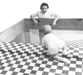 Starting at about 8–10 months, infants begin to engage in social referencing, in which they refer to another, often an adult or caregiver, to inform their reaction to environmental stimuli.[7] In the classic visual cliff experiments, 12-month-old babies who were separated from their mothers by a plexiglass floor that appeared to represent a dangerous “cliff” looked to their mothers for a cue.[11] When mothers responded to their infants with facial expressions signaling encouragement and happiness, most infants crossed over the cliff. In contrast, if mothers displayed fear or anger, most infants did not cross.