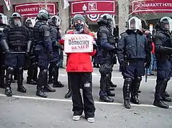 - peaceful movements - various movements which use nonviolent means of protest as part of a campaign of nonviolent resistance, also often called civil resistance. The American Civil Rights Movement, Polish Solidarity movement or the nonviolent, civil disobedience-orientated wing of the Indian independence movement would fall into this category.[34]
