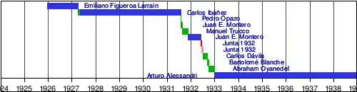 Over the course of the years 1926 and 1927, General Carlos Ibáñez del Campo maneuvered his way into power, first as the Minister of War, then Minister of the Interior, then Vice President, before finally on May 4, 1927, President Figueroa resigned as president.[2] Between 1927 and 1931, Chile was governed by General Carlos Ibáñez del Campo, who carried out a corporatist policy, in order to undermine the influence of leftist groups.