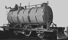 These closed-loop steam engines had no firebox. The boiler was jacketed by a container loaded with about 5 tons of caustic soda (sodium hydroxide). When water or steam came in contact with the caustic soda, it would generate heat—enough to actually run the boiler and generate more steam. Steam emanating from the boiler would be fed through pistons to propel the locomotive forward, and the exhaust steam from the pistons would be fed into the caustic soda to continue the cycle. These vehicles were virtually silent, because the steam was not released into the atmosphere.