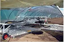 Outdoors, a hood is positioned either manually or via tractor with a special pre-stressed 4 point suspension arm. Steaming time amounts to 30 min for a penetration down to 25 cm depth. Hereby a temperature of 90 °C can be reached. In large stable glasshouses, the hoods are attached to tracks. They are lifted and moved by pneumatic cylinders. Small and medium-sized hoods up to 12 m2 are lifted manually using a tipping lever or moved electrically with special winches.