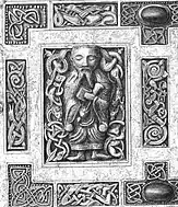 Mac Flaithbertach had two obituaries in 1025, but like nearly all 11th-century craftsmen, nothing is known of Gilla Baíthín.[33] Analysis of the style and technique of the 11th-century phase indicate a single hand created the figurative panels on the front and sides, the filigree, the zoomorphic panels and the strap-hinge.[10] The art historian Mitchell Perette describes Baíthín's script as "remarkably uneven".[35] The first-name Gilla is also inscribed on later 11th- and 12th-century Irish high crosses and churches, indicating that it was a name "taken for Christian life", and that Baíthín was a cleric.[36] The art historian Patrick Wallace notes that the naming of a craftsman in such an early work indicates the esteem Insular craftsmen must have enjoyed in contemporary Irish society, noting how mainland European artists did not begin to sign their works until the Renaissance. He goes on to write that the signature may be "one of the earliest instances anywhere of a culture which made such acknowledgement[s]."[37]