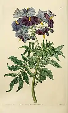 - ↑ Gavrilenko, T.; Thieme, R.; Heimbach, U.; Thieme, Th. (2003). "Fertile somatic hybrids of Solanum etuberosum (+) dihaploid Solanum tuberosum and their backcrossing progenies: relationships of genome dosage with tuber development and resistance to potato virus Y". Euphytica. 131 (3): 323–332. doi:10.1023/A:1024041104170. S2CID 33877529.