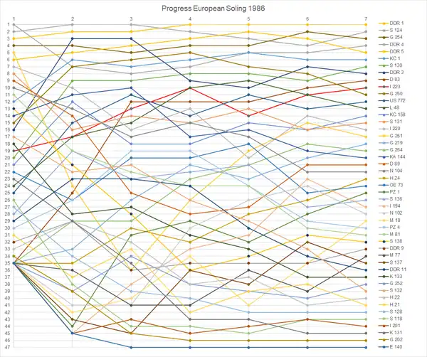 Remarkable is that the Norwegian team won this European Championship without a single race victory. The team of Jochen Schumann was in the lead until the final leg of the event. On the last moment team Terje Wang took the 8th place in the final race thus winning the event by just one point!