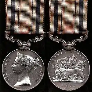 The South Africa Medal (1853) was awarded to surviving[2] participants in one or more of three campaigns in the eastern Cape of Good Hope and the Battle of Berea:[4]