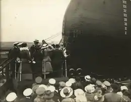 Brazil's Minas Geraes, the lead ship, was laid down by Armstrong on 17 April 1907, while its sister São Paulo followed on 30 April at Vickers. Completion of the partial hull needed to launch Minas Geraes was delayed by a five-month strike to 10 September 1908. São Paulo followed on 19 April 1909.[85] Both were christened in front of large crowds by the wife of Francisco Régis de Oliveira, the Brazilian ambassador to the United Kingdom.[86] After fitting-out, the period after a warship's launch where it is completed, Minas Geraes was put through multiple trials of the speed, endurance, efficiency, and weaponry of the ship in September, including what was at that time the heaviest broadside ever fired off a warship. Minas Geraes was completed and handed over to Brazil on 5 January 1910.[87] The trials proved that the blast from the class' superfiring upper turrets would not injure crewmen in the lower turrets. The ship itself managed to reach 21.432 knots (24.664 mph; 39.692 km/h) on an indicated horsepower (ihp) of 27,212.[88] São Paulo followed its classmate in July, after its own trials at the end of May, where the ship reached 21.623 knots (24.883 mph; 40.046 km/h) at 28,645 ihp.[89]