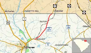 South Carolina Highway 177 (SC 177) is a 7.820-mile (12.585 km) primary state highway in the U.S. state of South Carolina. It connects the community of Wallace with Hamlet, North Carolina.