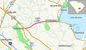 South Carolina Highway 311 (SC 311) is a 9.250-mile-long (14.886 km) state highway in the southeastern part of the U.S. state of South Carolina. The highway travels in a west-to-east orientation from Sandridge, which is approximately six miles (9.7 km) southeast of Holly Hill, to a point approximately four miles (6.4 km) south of Cross.