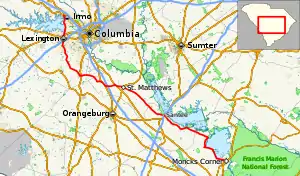 The highway runs generally southeast from the central part of South Carolina to near the Atlantic Ocean and is listed as a hurricane evacuation route.[1]