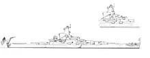 On 26 July 1954, a conversion proposal for the South Dakota–class ships was ordered by the Chairman of the Ship Characteristics Board. The request was made for the ships' speed to be increased to at least 31 knots. To do so, the design staff decided to remove the after turret and use the weight and space gained to install either a set of improved steam turbines or a set of gas turbines. Either system would have to produce at least 256,000 shaft horsepower (190 MW)—the minimum requirement to achieve 31 knots on the South Dakota hull. Unfortunately, this would have necessitated alterations to the hull form, particularly in the rear of the ship. Larger propellers were also required, and all four shafts would have had to have been completely rebuilt to accommodate the changes. Estimates for the project ran as high as $40,000,000 per ship, and this did not include the cost of reactivating the ship and upgrades to its electrical and combat systems. As a result, the conversion program was halted.[36]