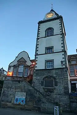 In 1807, an octagonal belfry was added to the steeple and, in 1817, a plaque and a fountain were unveiled on the stairway up to the steeple to commemorate the contribution by Archibald Primrose, 4th Earl of Rosebery who had provided a bleachfield and a water supply for the town.[3] In 1888, clock faces were added to commemorate the Golden Jubilee of Queen Victoria, an innovation which the historian, Thomas Scott Muir, regarded as having "disfigured" the steeple.[7]