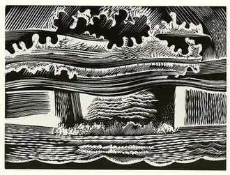 Hyde made Southern Cross to express his anger at American nuclear tests in the Bikini Atoll in 1946 following the atomic bombings in Japan.[10] He worked on it from 1948 to 1951.[10] Each image is 4 by 3 inches (10.2 cm × 7.6 cm),[11] centred at the top third of the page and with broad margins.[12] The one exception is of the bomb detonating, a 7 in × 6 in (18 cm × 15 cm) full-page image that bleeds off the page.[11] Hyde carved dynamic curving lines uncommon in wood engraving. Blacks overwhelms the figures they surround, and abstract images contrast with realistic detail in the flora and fauna.[5]