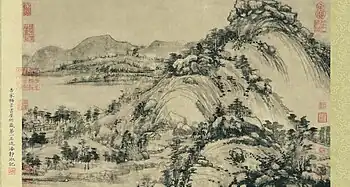 Although the term itself originates much later, the artists later attached to it go back to at least the Tang dynasty,[6] with a larger group from (rather confusingly) the Northern Song dynasty. In the latter period the tradition of literati landscape painting seems to have acquired most of the characteristics that it kept throughout its history, and a number of writings on theory have survived from it; the extent to which actual works by Tang or Song masters have survived is still a matter of controversy.[7] Several of the famous names from the periods between the Tang and Song periods were very high officials,[8] but in later periods landscape painting became a refuge and form of muted protest within their class for officials out of favour, or who opposed and avoided the court.[9] During the Qing period (1644-1911), the canons of classical Chinese painting mainly derived from the criteria set out by Dong Qichang, Mo Shilong (1537?-1587), and Chen Jiru (1558-1639). They identified two different schools: the “Northern School of Painting” and the “Southern School of Painting”, also called “Literati Painting”. They were inspired by two schools formed by the schism of Chan Buddhism during the Tang Dynasty: the Northern Chan school and the Southern Chan school.[10]