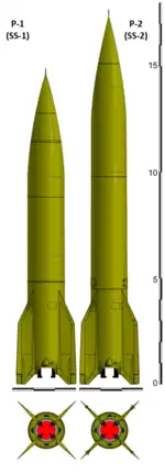 Like its predecessor, the R-1, the R-2 was a single-stage missile using ethanol as a fuel and liquid oxygen as an oxidizer.[59] The R-2 had a range of 600 kilometres (370 mi), twice that of the R-1, while maintaining a similar payload of around 1,000 kilograms (2,200 lb).[60] At a length of 17.65 m (57.9 ft) and a mass of 19,632 kg (43,281 lb), the R-2 was 2.5 m (8 ft 2 in) longer and the dry weight of 4,528 kg (9,983 lb) was about 500 kg (1,100 lb) heavier than the R-1. Maximum body diameter remained 1.65 m (5 ft 5 in), the same as the R-1.[61][62]