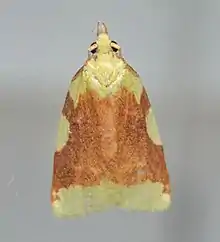 The wingspan is about 17 mm.[3] The forewings are dark brown, except for a light yellow band across the base and the wingtip and a yellow semicircular patch. The hindwings are white. Adults are on wing from June to August.[4]