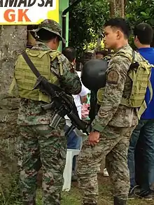 Philippine National Police Special Action Force operators in combat gear, including digital camouflage uniforms while conducting protection duties in Masbate during a Gawad Kalinga activity.