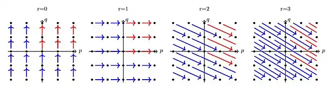 A doubly graded spectral sequence has a tremendous amount of data to keep track of, but there is a common visualization technique which makes the structure of the spectral sequence clearer. We have three indices, r, p, and q. An object can be seen as the checkered page of a book. On these sheets, we will take p to be the horizontal direction and q to be the vertical direction. At each lattice point we have the object . Now turning to the next page means taking homology, that is the page is a subquotient of the page. The total degree n = p + q runs diagonally, northwest to southeast, across each sheet. In the homological case, the differentials have bidegree (−r, r − 1), so they decrease n by one. In the cohomological case, n is increased by one. The differentials change their direction with each turn with respect to r.
