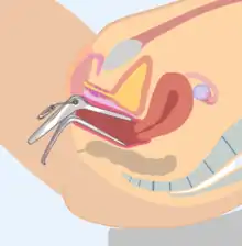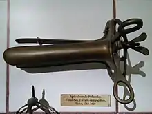 Vaginal and anal specula were used by the ancient Greeks and Romans,[2][3] and speculum artifacts have been found in Pompeii.[4][5] The modern vaginal speculum, developed by J. Marion Sims, consists of a hollow cylinder with a rounded end that is divided into two hinged parts, somewhat like the beak of a duck. This speculum is inserted into the vagina to dilate it for examination of the vagina and cervix.
