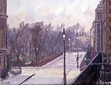 Gore's painting Richmond Park, thought to have been painted in the autumn of 1913 or shortly before the artist's death in March 1914, was exhibited at the Paterson and Carfax Gallery[9] in 1920. In 1939 it was exhibited in Warsaw, Helsingfors and Stockholm by the British Council as Group of Trees.[10] It is now in the collection of the Tate Gallery under its original title but is not currently on display.[10] It is not certain where in the park the picture was made but a row of trees close to the pond near Cambrian Gate has a very close resemblance to those in the painting.[11] Another Gore painting, with the same title (Richmond Park), painted in 1914, is at the Ashmolean Museum. His painting Wood in Richmond Park is in the Birmingham Art Gallery's collection.[12]