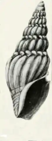 (Original description) The solid, subfusiform shell is greenish white. The interior of the aperture is dark green. The shell contains 7½ whorls, including a protoconch of two smooth rounded whorls. The sculpture consists of numerous strong, smooth, rounded ribs, which are not separated by any intermediate space, and which spring directly from the suture. There are about 15 of these ribs on the penultimate whorl. A deep groove or depression on the upper part of the whorl almost reduces the ribs to vanishing point, above which they reappear with a strong bend towards the left, and give the effect of a row of tubercles at the suture. There is one faint impressed line about the upper third of the body whorl, and a number on the base. The aperture is short and broad, widely open anteriorly, with scarcely any contraction for a siphonal canal. The outer lip is simple, rounded, with a deep notch at the suture. The columella is strongly arched. The lip is broadly expanded over the body whorl, developing a strong callosity where it curves round above the sinus. The operculum is ovate, with an apical nucleus.