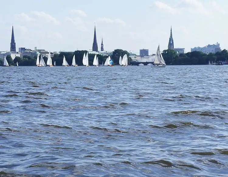 The Vierländer Schützengesellschaft (approximate translation: Vierlande Shooting Club) is one of the oldest still existing organisation in Hamburg. It was established in 1592.[1] In 1830 the Hamburg Chess Club (Hamburger Schachklub, HSK or HSK von 1830) was founded.[2] Der Hamburger Ruder Club[notes 1] was founded in 1836, as one of the oldest rowing clubs in the world. In 1934 it was merged with the Germania Ruder Club (GRC), to form Der Hamburger und Germania Ruder Club (HGRC). The Germania Ruder Club's coxed fours won rowing at the 1900 Summer Olympics in Paris.[3] On 20 January 1900, the FC Association 1893 Hamburg and FC Eintracht Altona were two of 86 founders of the German Football Association.[4] As old as the history of sports clubs in Hamburg, as old is the history of competing and hosting tournaments. The 3rd Chess Olympiad organized by the German Chess Federation took place between 13 and 27 July 1930, in Hamburg.[5] 12 players from the Hamburg Chess Club won the German Team Championship in 1956 and 1958. In 1987 the Hamburg Chess Club were German Cup winner (Pokalsieger).[6]