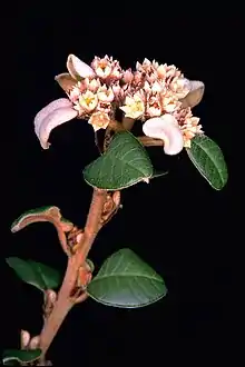 Spyridium gunnii is a species of flowering plant in the family Rhamnaceae and is endemic to Tasmania. It is an upright shrub with more or less glabrous, egg-shaped leaves, the narrower end towards the base, and mostly more than 12 mm (0.47 in) long. The heads of flowers are arranged in cymes surrounded by 2, 3 or more floral leaves. The sepals are about 3 mm (0.12 in) long and woolly-hairy on the outside.[2][3]