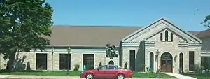 The parish continued to grow. By 1847 there were 450 parishioners, which was still a quarter of the town's population.[4] In 1850 the front section of the present church was begun. Thomas Doyle and Henry Belken were responsible for constructing the new church.[17] The building, completed in 1853 in the simple Greek Revival style, was built of locally quarried stone and measured 94 by 44 feet (29 by 13 m).[15] The original building was remodeled for more classroom space at this time. The rectory was built around 1877.
