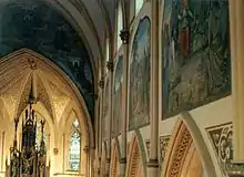 During the 1880s, Lamprecht of Munich installed painted scenes from the life of Christ above the arches of the bays.[1] The series of paintings continues into the sanctuary; they are in the style of the Overbeck school of art.[2] Fourteen images of the stations of the cross, carved from wood by Italian craftsmen, were installed in 1871.[4]