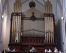 St. John's church features a historic pipe organ, located in the gallery. The instrument, built in 1879,[1] is Opus 950 of E. and G.G. Hook & Hastings,[2] a Boston organ building firm which was one of the premier organ building firms in the United States. The $7,000 contract[1] was signed on June 9, 1879, and the organ was played for the first time on December 11, 1879. It contains 2,412 pipes in 38 ranks, with pipes ranging in length from 16 feet (4.9 m) to 0.5 inches (1.3 cm).[7] The longest pipes, those of the Great Open Diapason 16', are visible in the facade, and the large wooden pipes of the pedal Open Diapason 16' form the side facades. At the 1979 centennial of the organ, the Organ Historical Society cited the instrument as having "particular historical" merit. This citation has only been granted to about 400 instruments since 1975. Further details about the organ are published in the database of Pipe Organs, operated by the Organ Historical Society.[8]