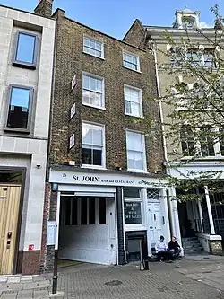 St. John is an English restaurant on St John Street in Smithfield, London. It was opened in October 1994 by Trevor Gulliver, Fergus Henderson, and Jon Spiteri on the premises of a former bacon smoke-house.[1] Under Henderson's guidance as head chef, St. John has specialised in "nose to tail eating", with a devotion to offal and other cuts of meat rarely seen in restaurants, often reclaiming traditional British recipes. Typical dishes include pigs' ears, ducks' hearts, trotters, pigs' tails, bone marrow and, when in season, squirrel. As a result, St. John has developed a following amongst gastronomic circles: "chefs, foodies, food writers and cooks on sabbatical".[2][3]