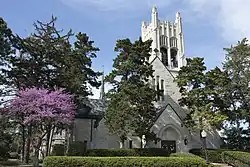 With a floorplan of 44′ × 132′ the church is the same dimensions as Solomon's Temple in Jerusalem[5] as well as the Sistine Chapel in Vatican City.[6] In 1952, Italian artist Sirio Tonelli installed his reproduction of "The Frieze of the Prophets" by American portraitist John Singer Sargent on the sanctuary wall. The stained glass windows were designed by the famed Charles Jay Connick studio of Boston.[7] In conformity with its Gothic character, a foliate disgorging Green Man adorns the north exterior wall beneath the rose window.